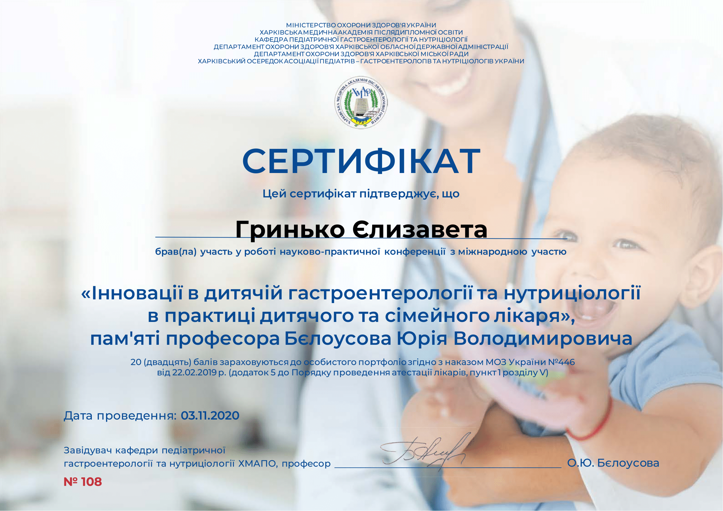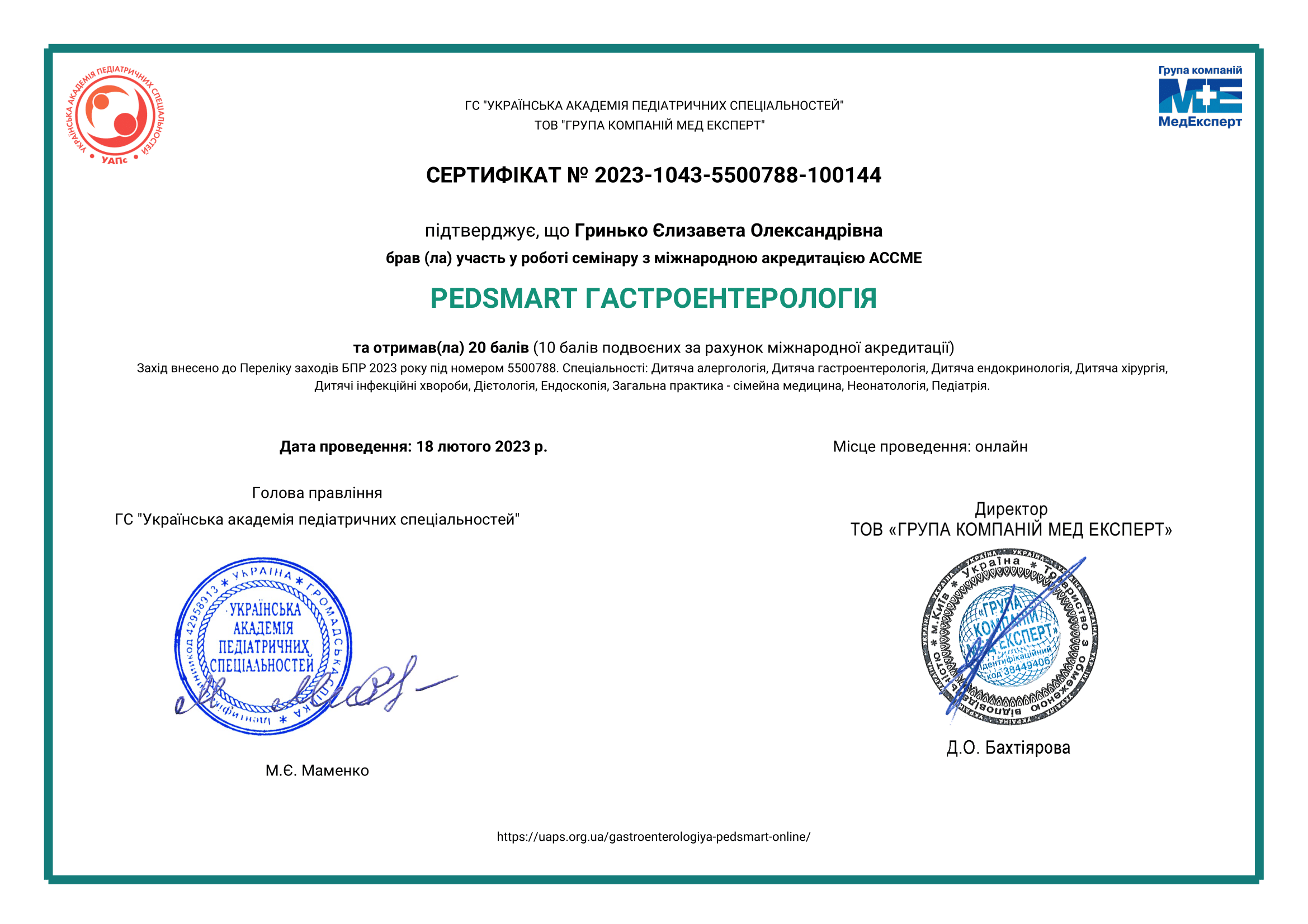 • 2022 р- підтвердження сертифіката лікаря- педіатра, Запорізький державний медичний університет