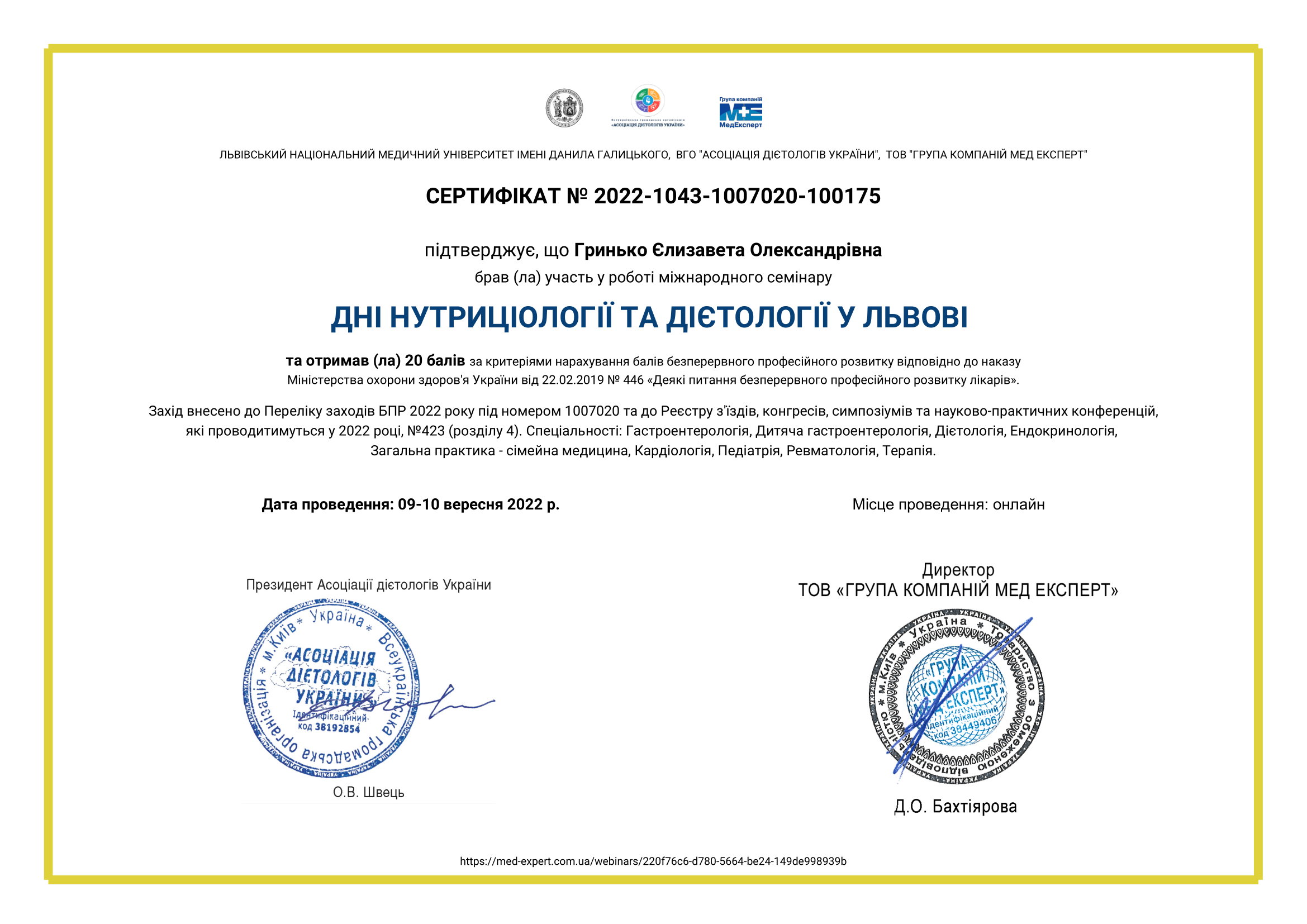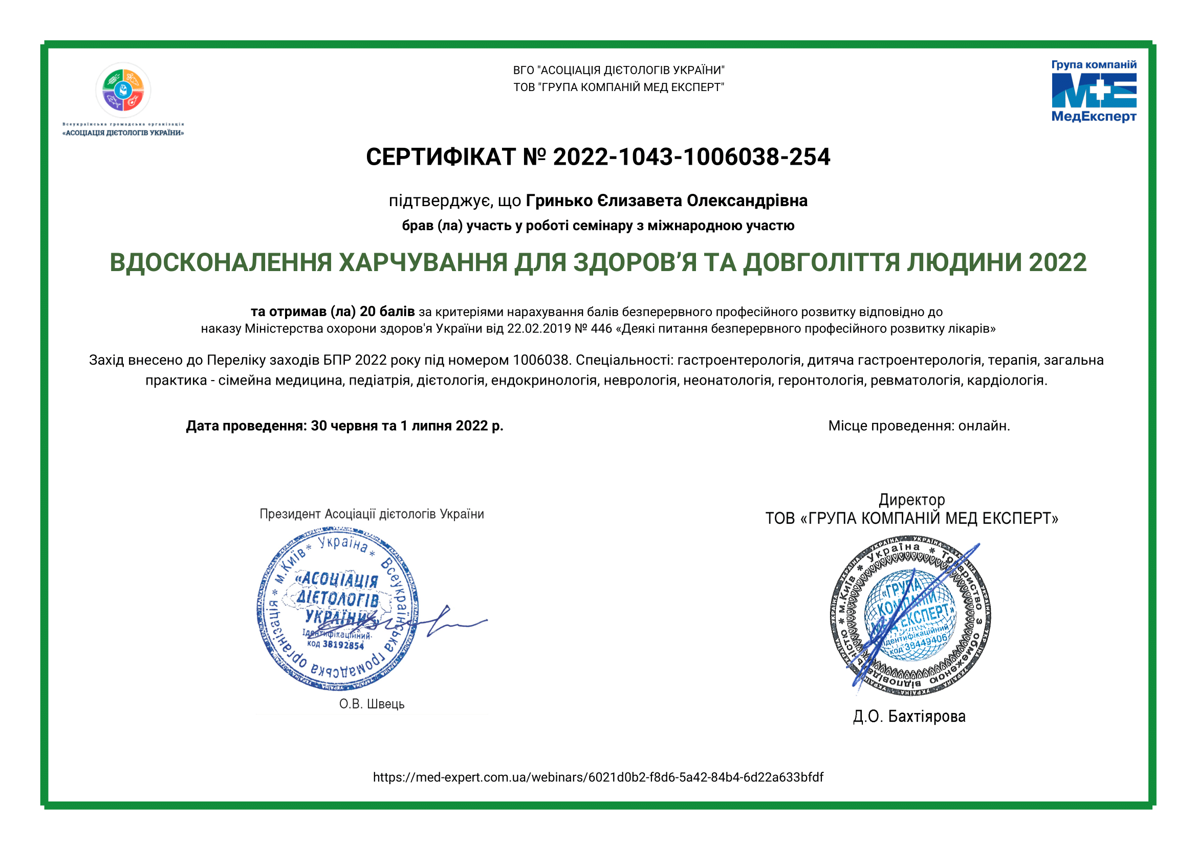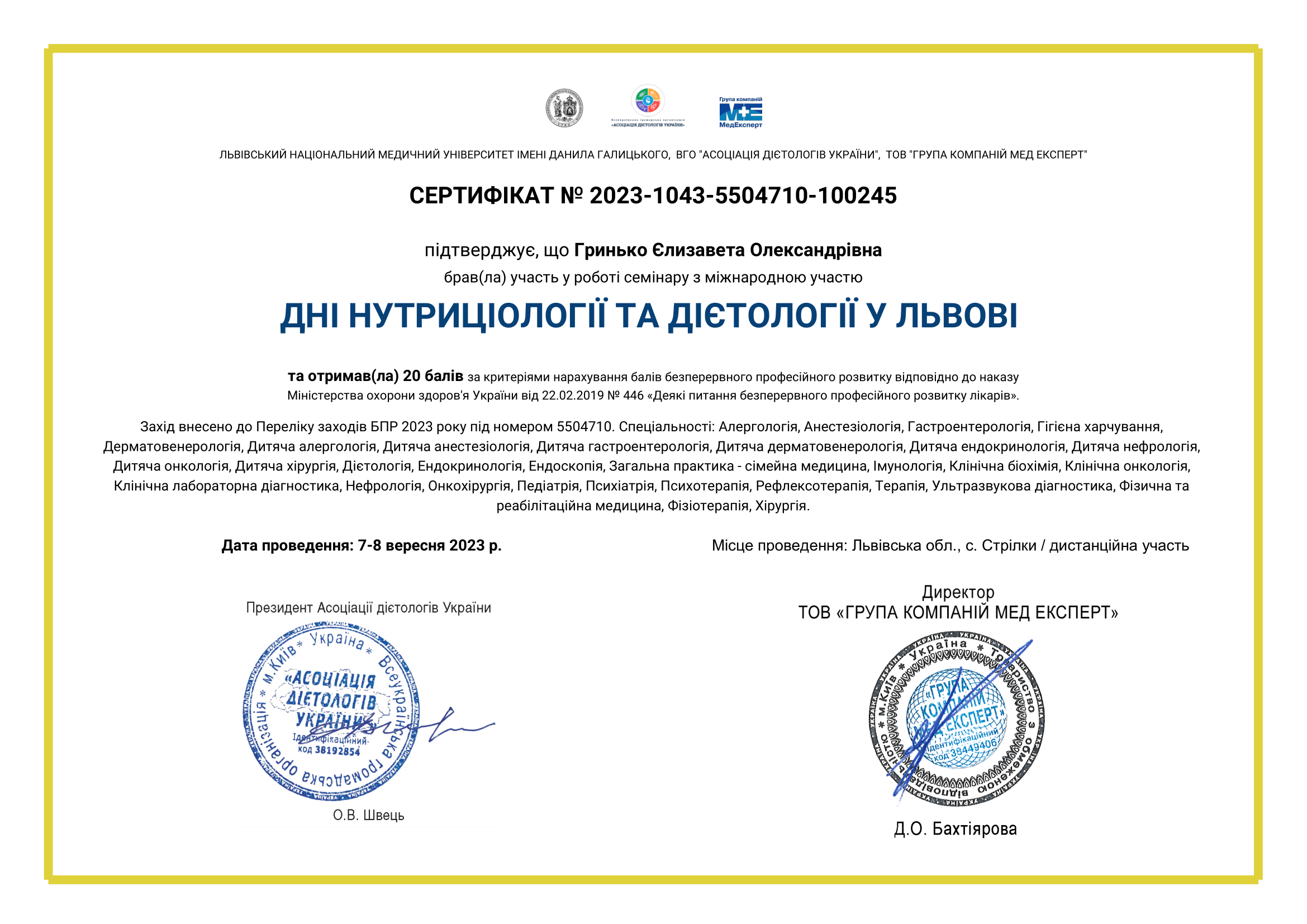 • 2024 р – отримання сертифіката лікаря- дієтолога, Львівський національний медичний університет