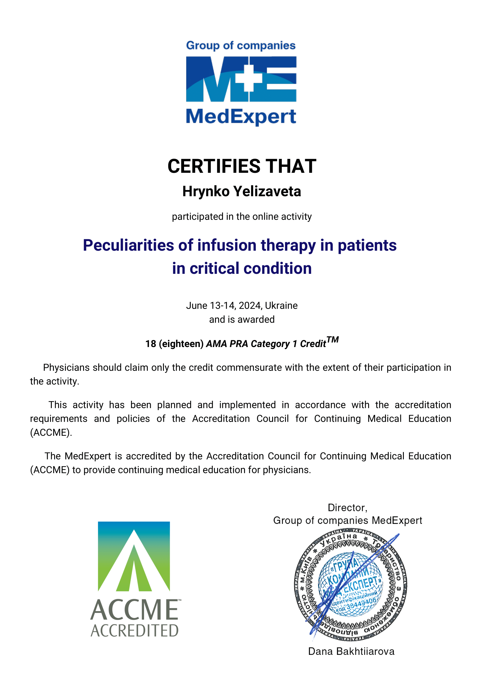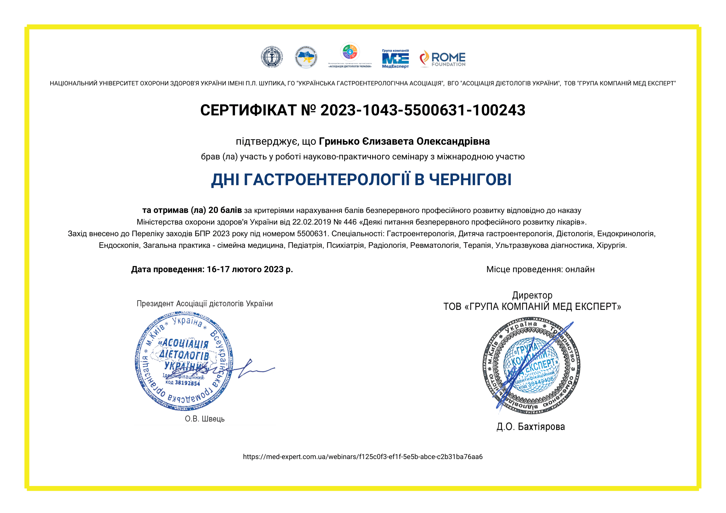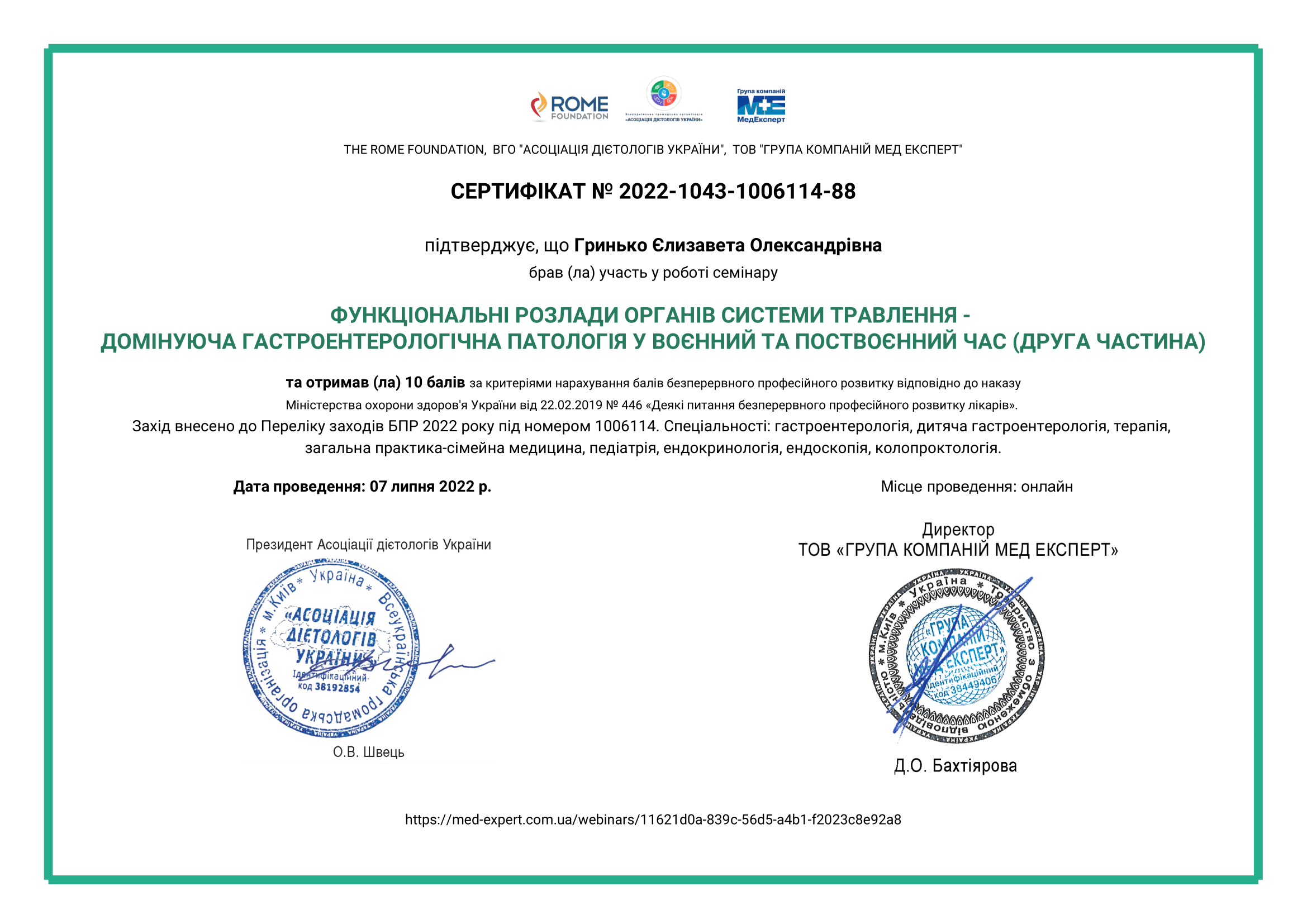 • 2024 р – отримання сертифіката лікаря- дієтолога, Львівський національний медичний університет