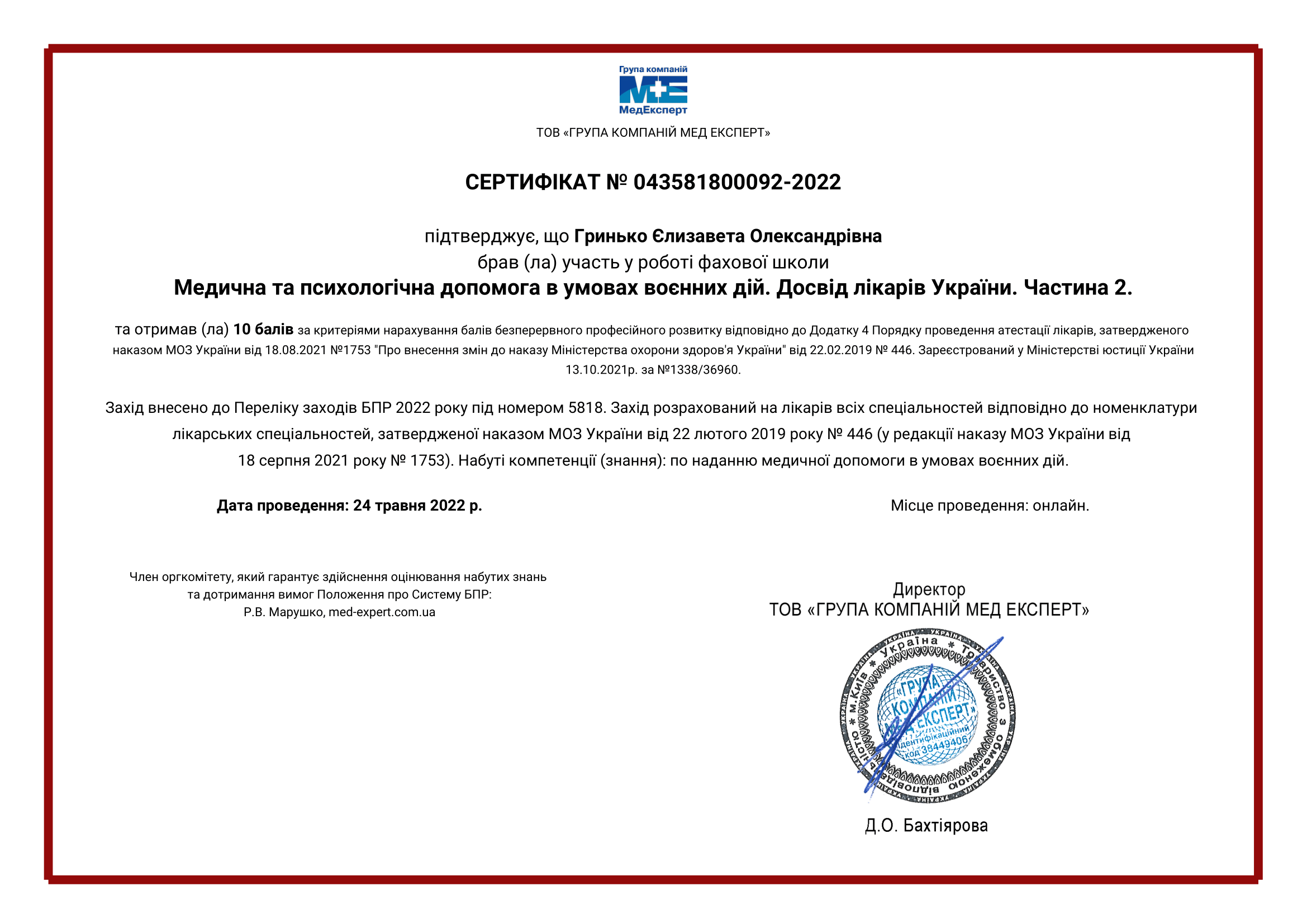 • “Медична та психологічна допомога в умовах воєнного часу”, 24.05.2022