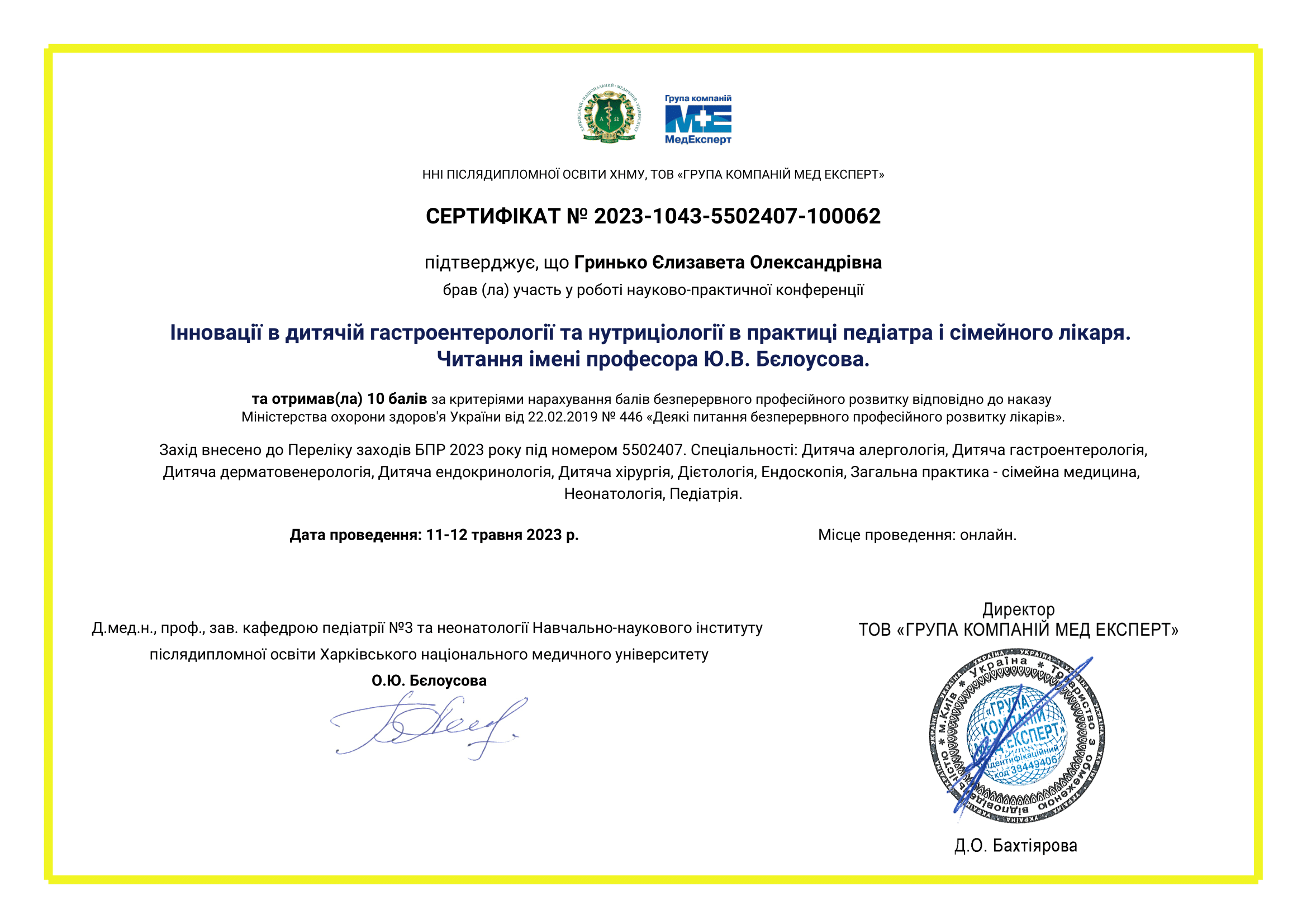 • “Інновації в дитячій гастроентерології та нутриціології в практиці педіатра і сімейного лікаря”, 11-12 травня 2023, Читання імені професора Ю.В. Бєлоусова.