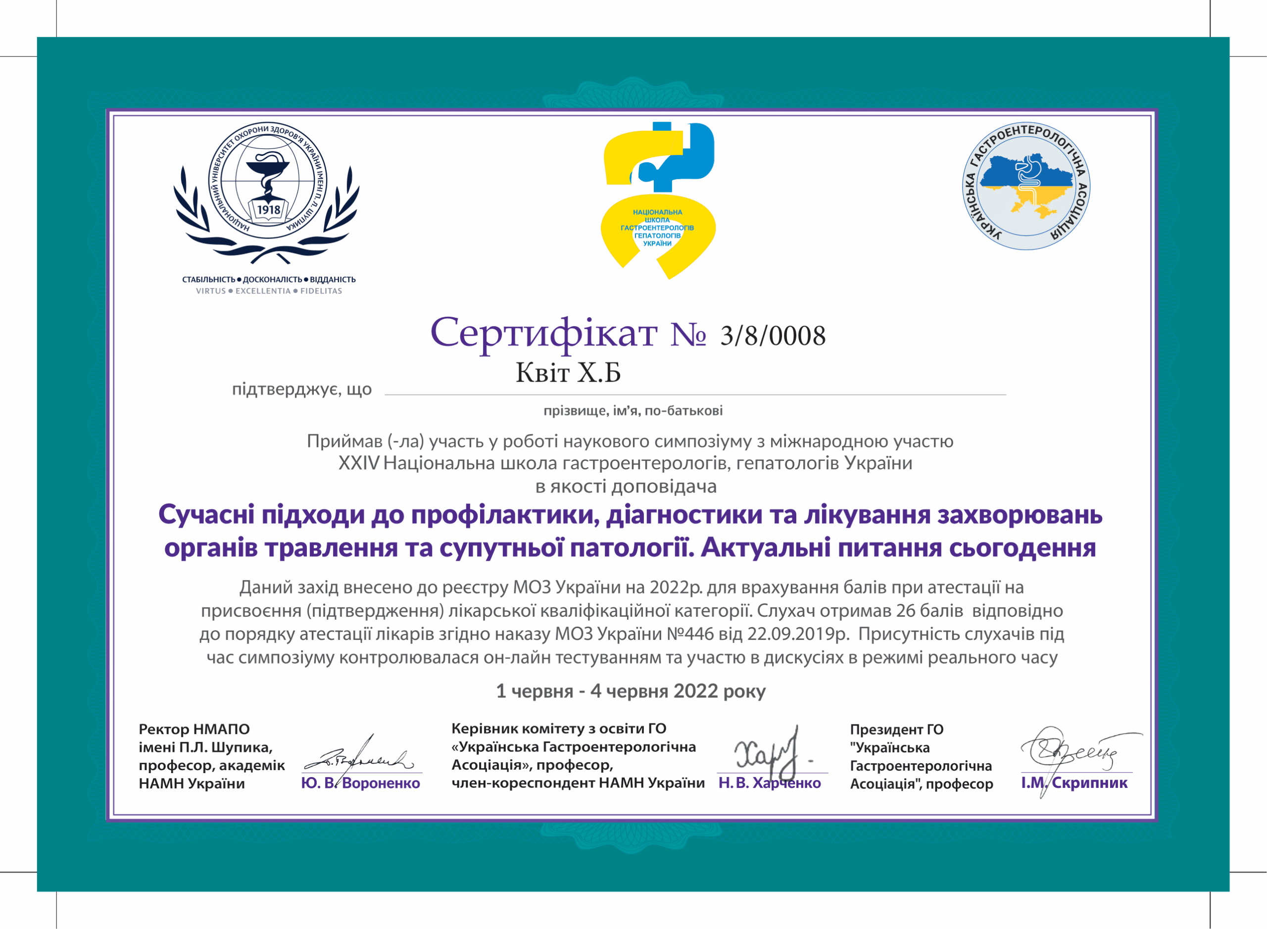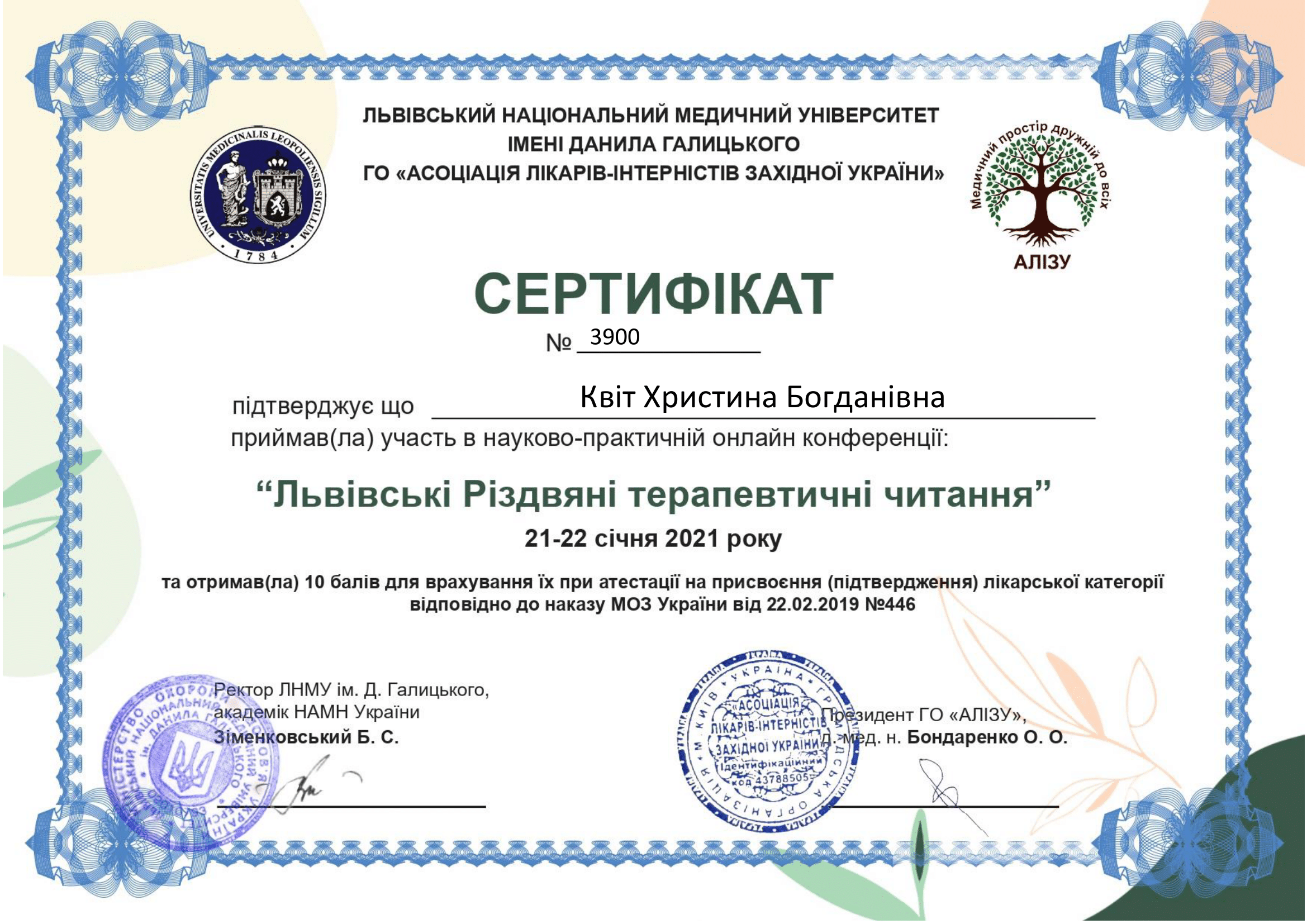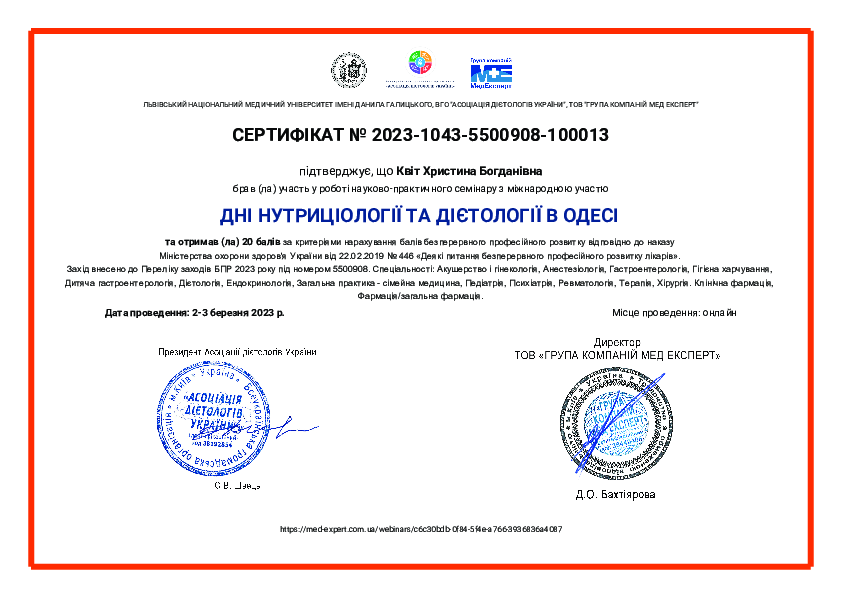 - 2022 р. – Львівський національний медичний університет імені Данила Галицького, отримання сертифікату за спеціальністю “Організація і управління охороною здоров’я”