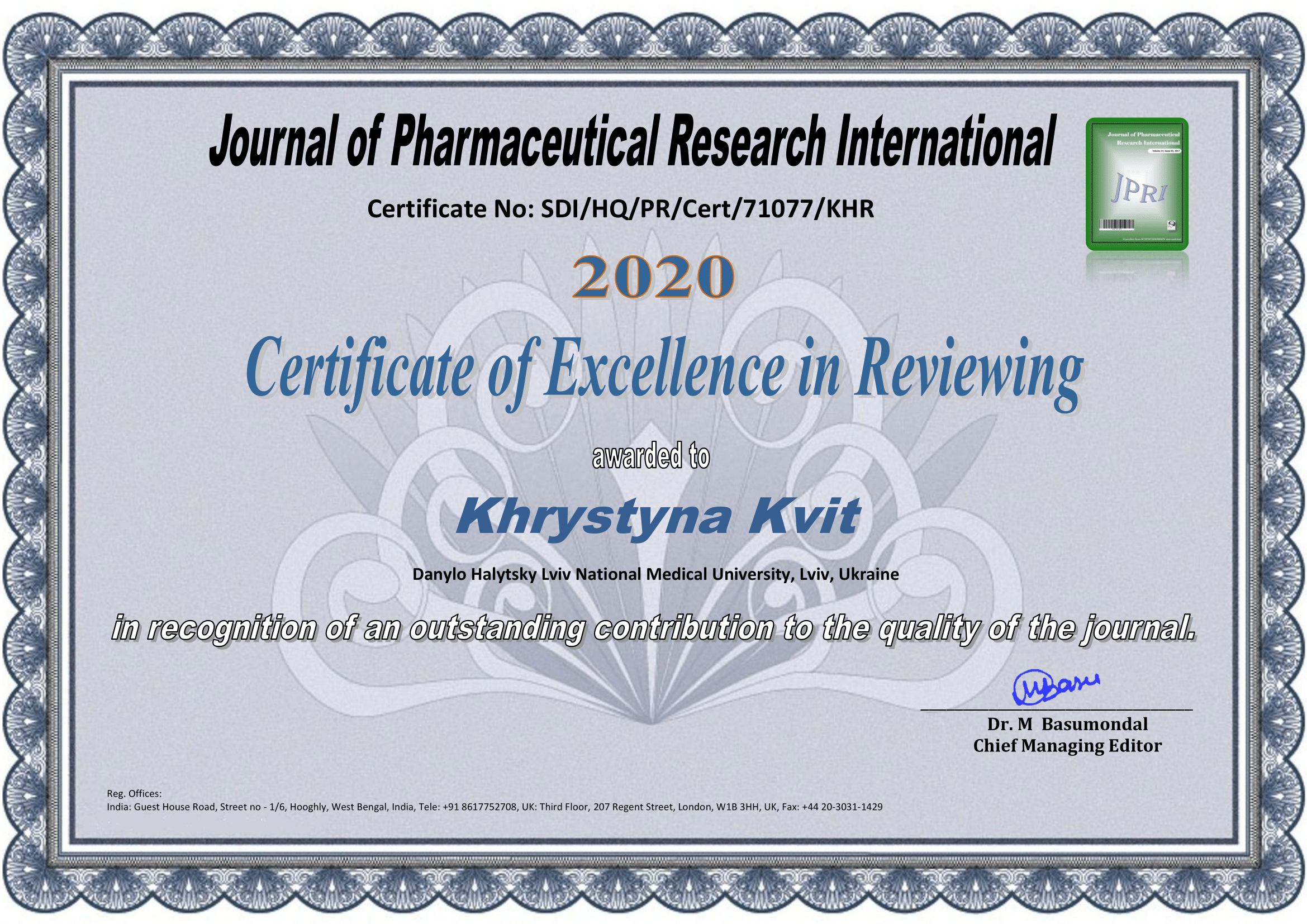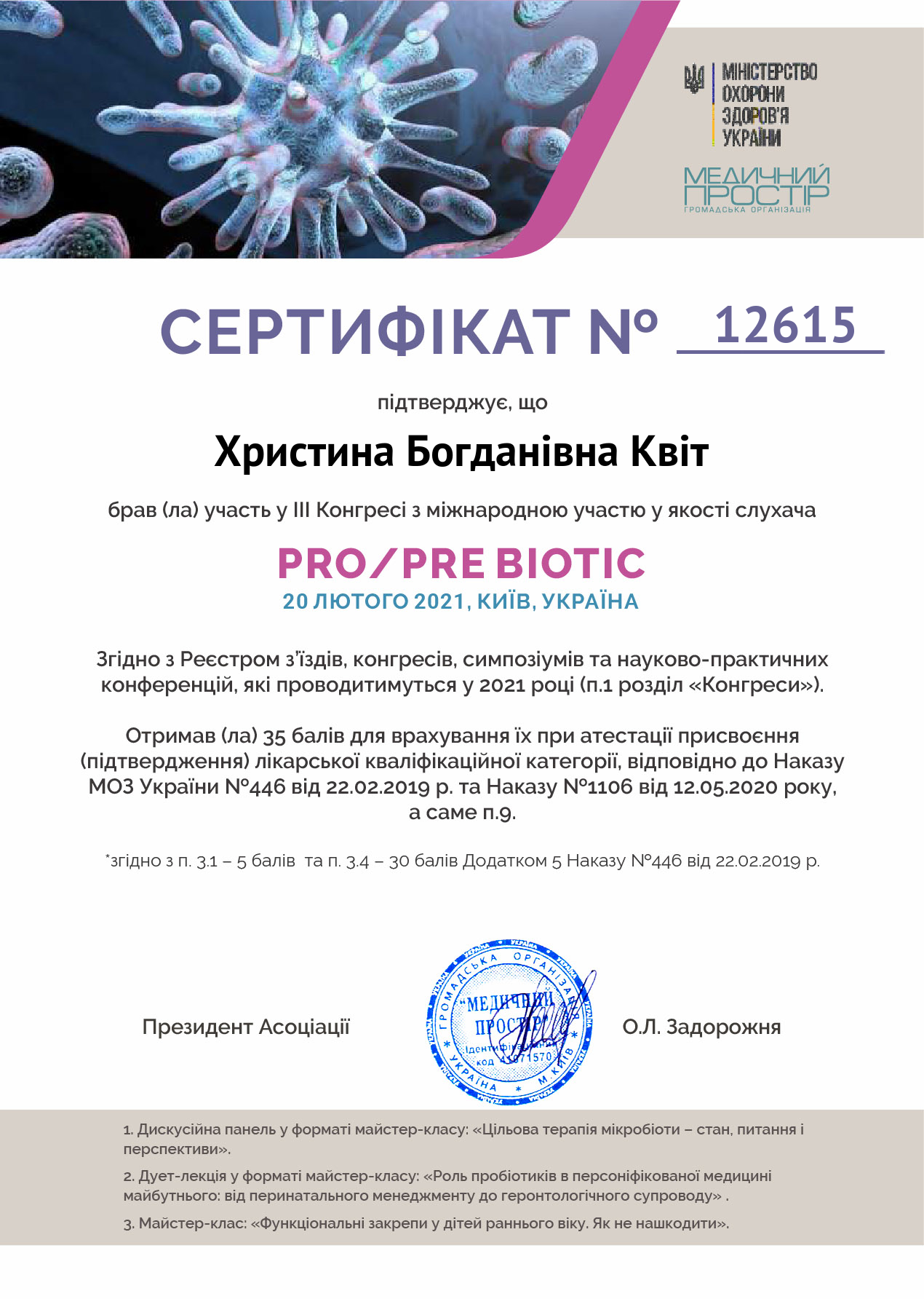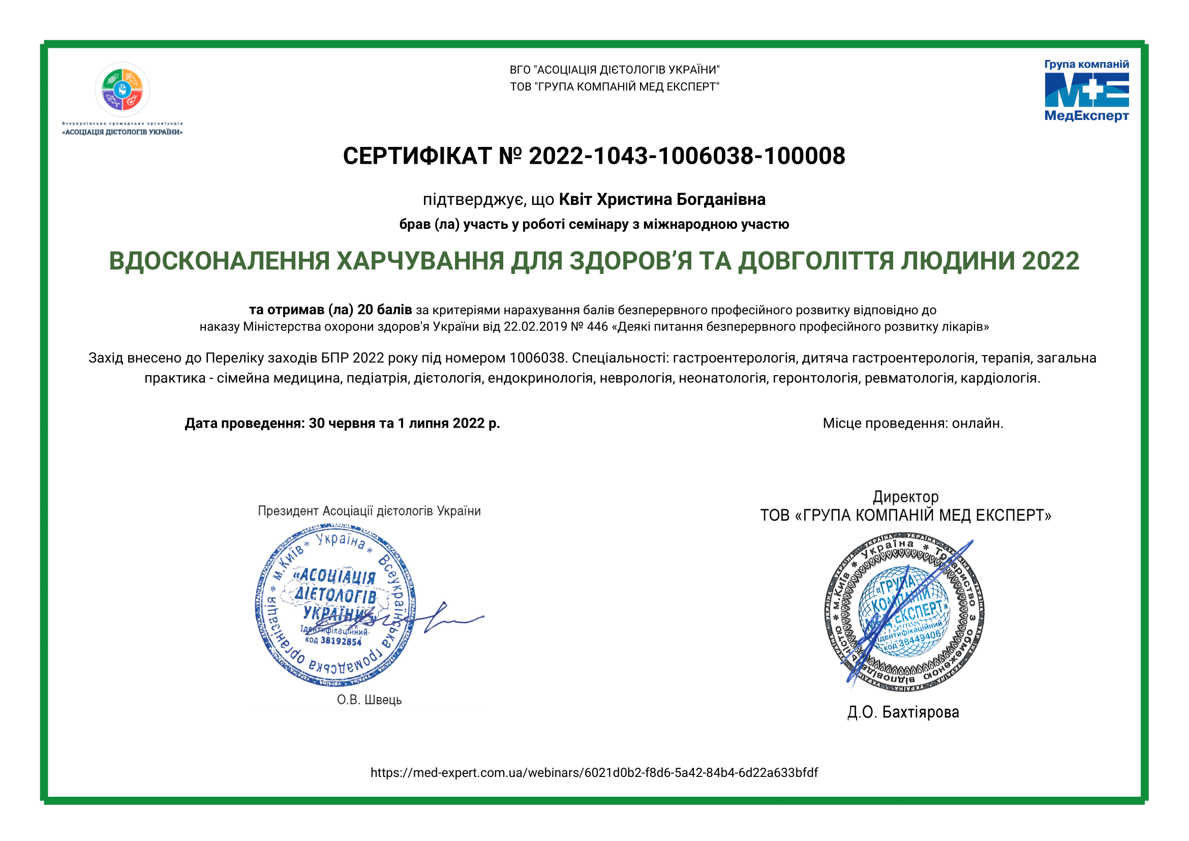 - 2022 р. – Львівський національний медичний університет імені Данила Галицького, отримання сертифікату за спеціальністю “Організація і управління охороною здоров’я”