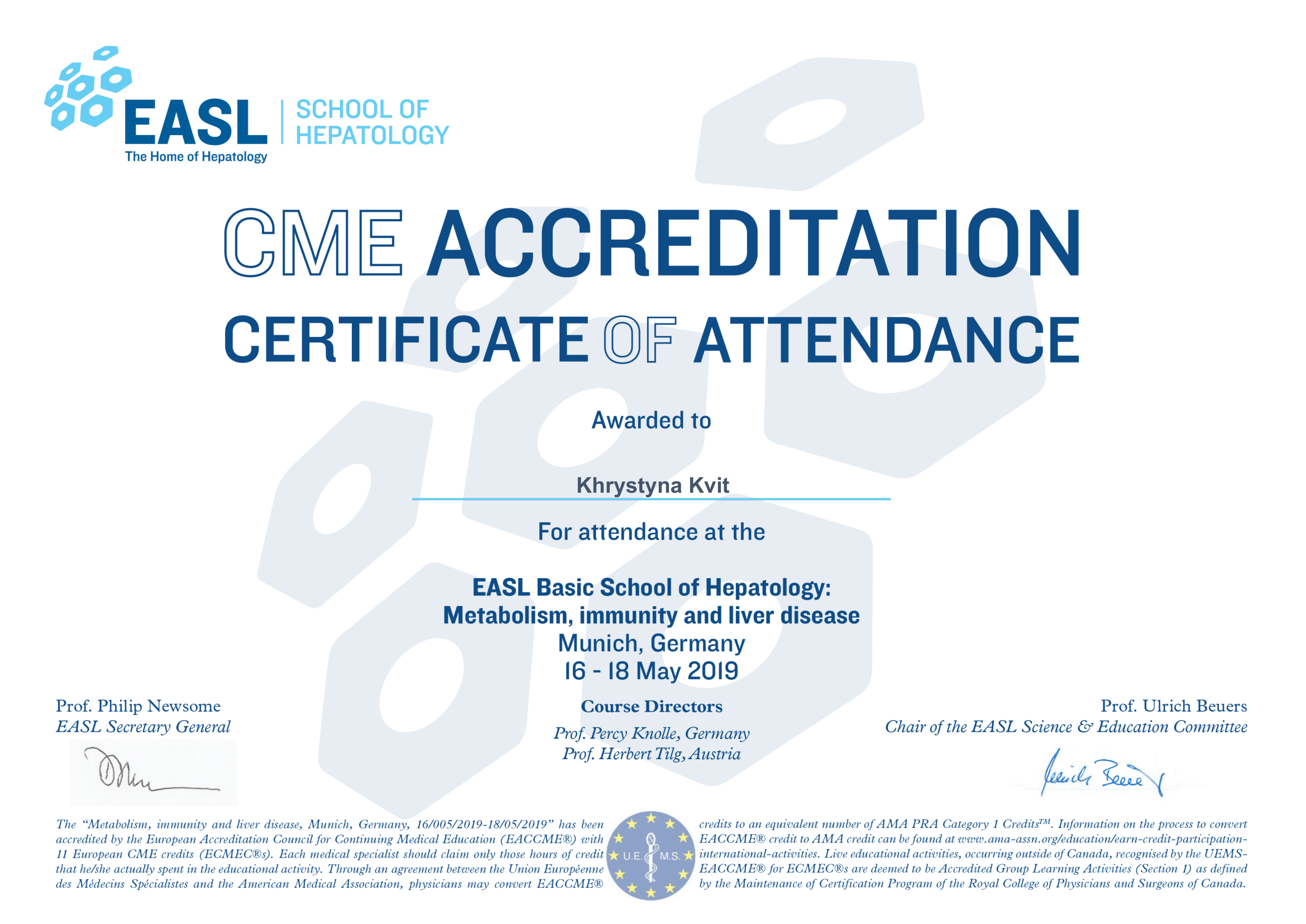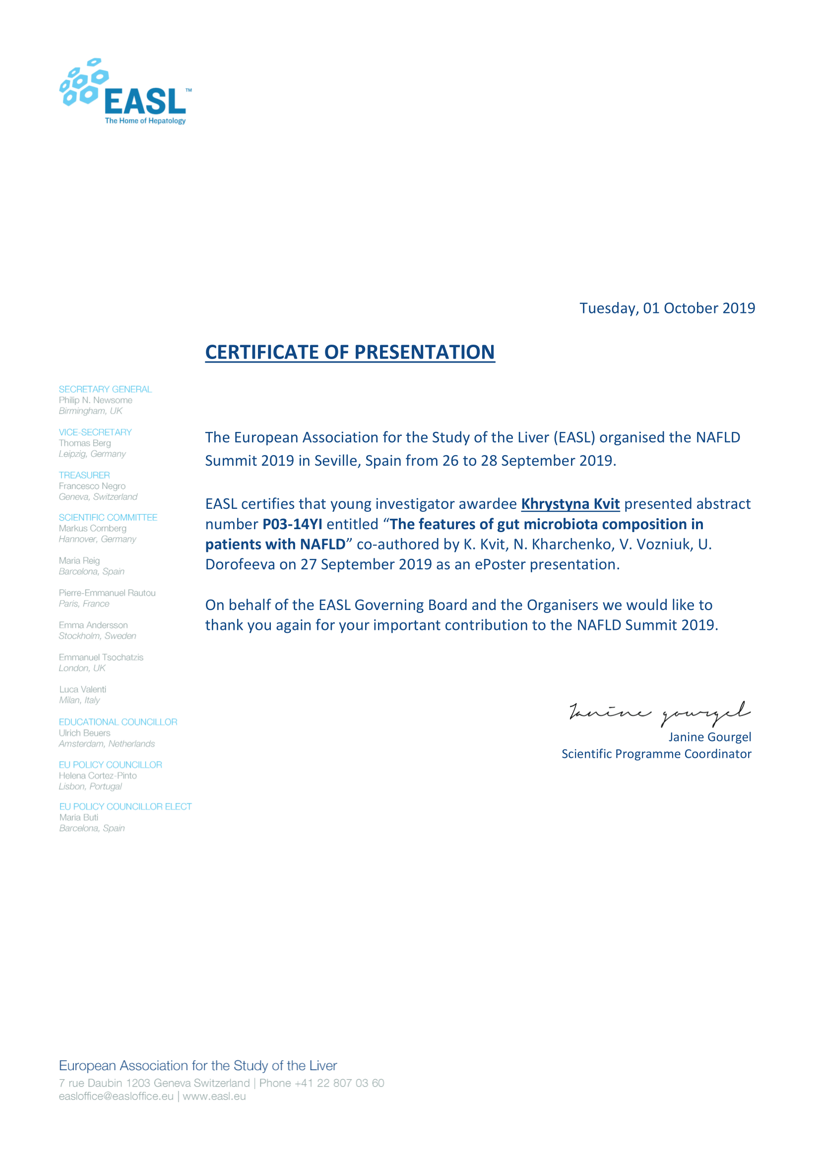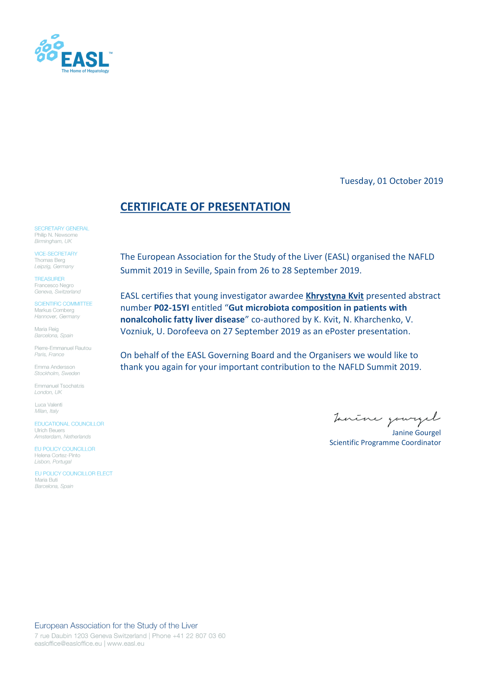 - European Associanion for the Study of the Liver Basic School “Metabolism, immunity and liver disease Basic School” (Munich, 2019)