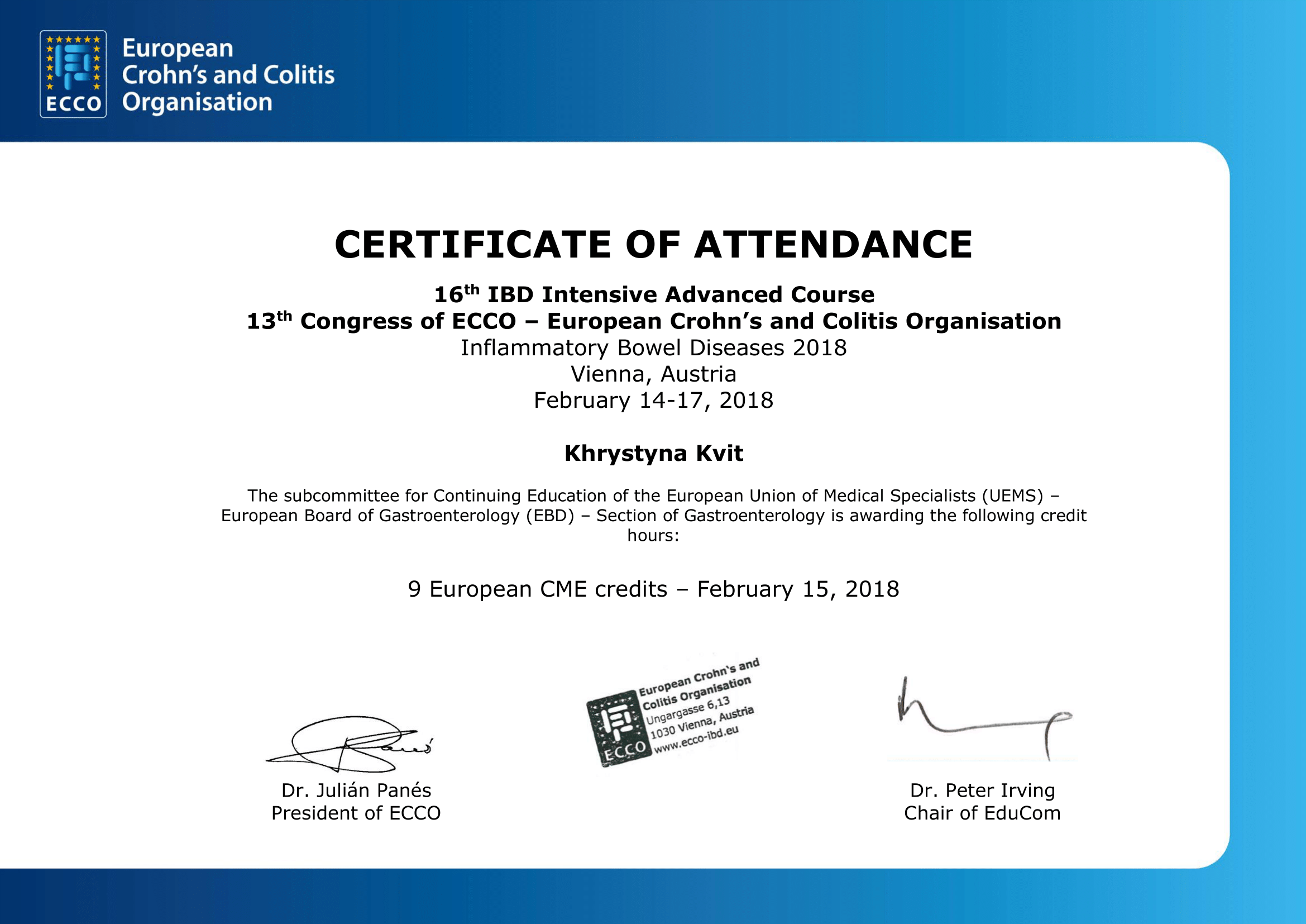- European Crohn´s and Colitis Organisation Intensive Course (Vienna, Austria, 2018)