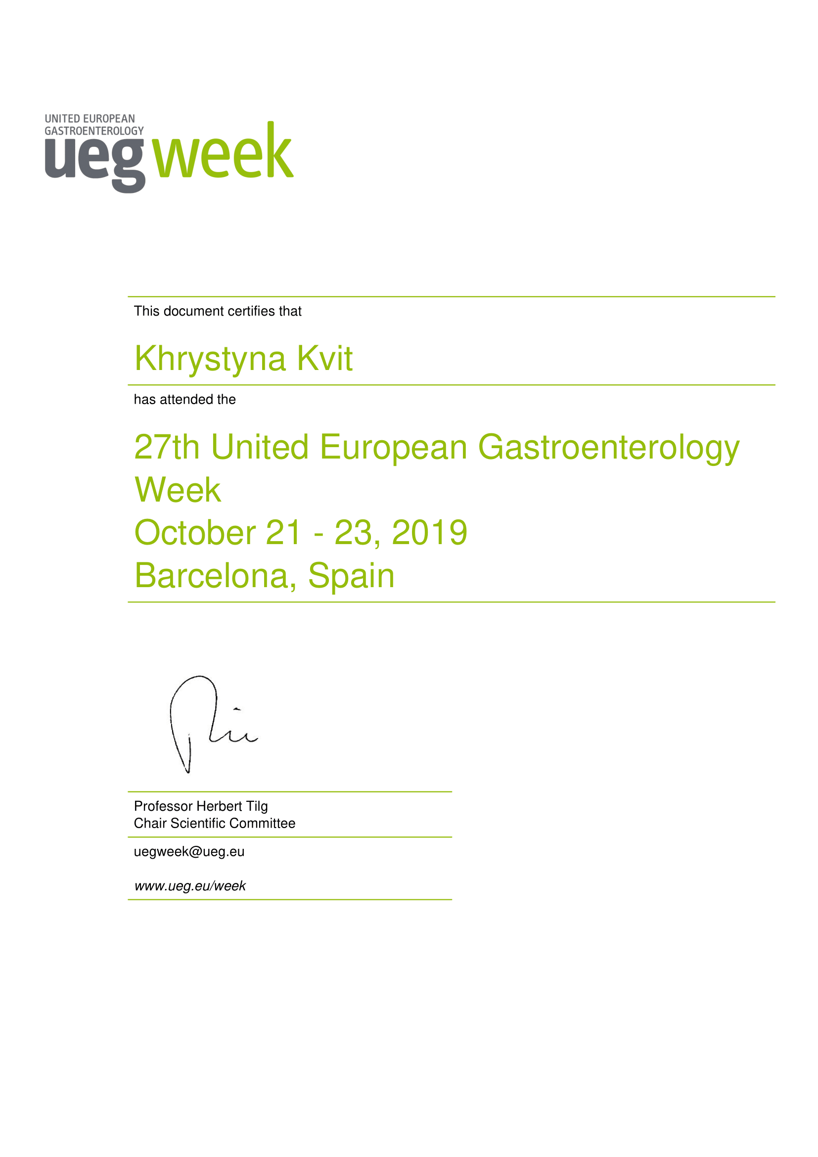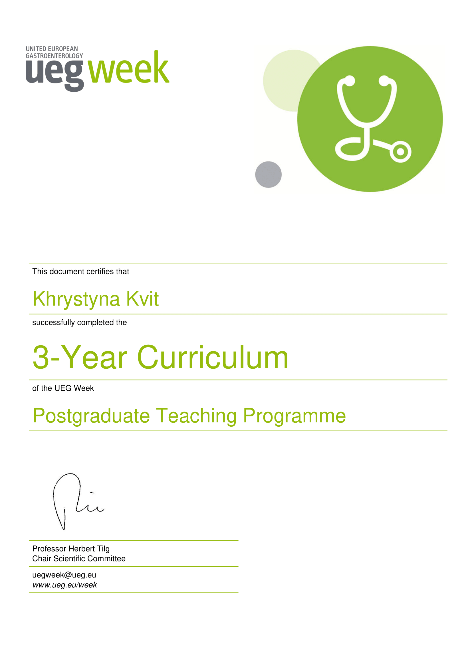 - Course of United European Gastroenterology Week Postgraduate Teaching Programme (Vienna, Austria, 2018)