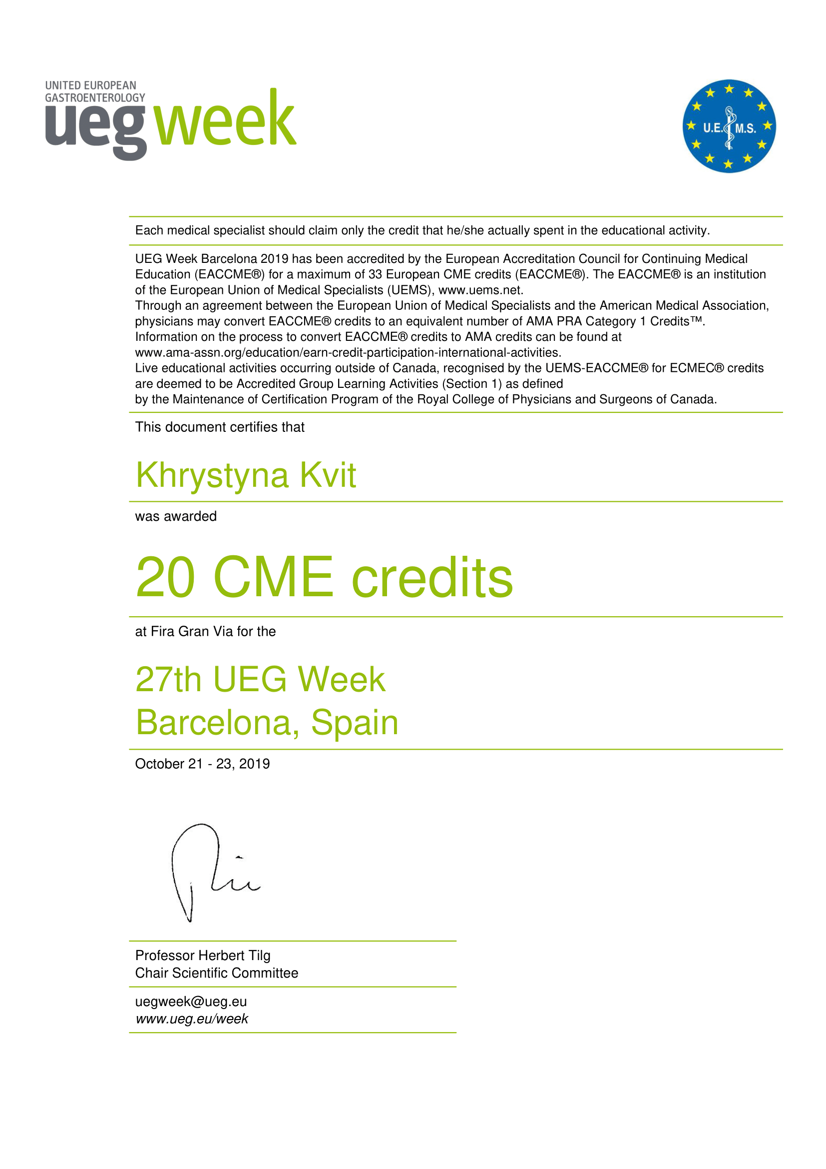 - Course of United European Gastroenterology Week Postgraduate Teaching Programme (Barcelona, Spain 2019)