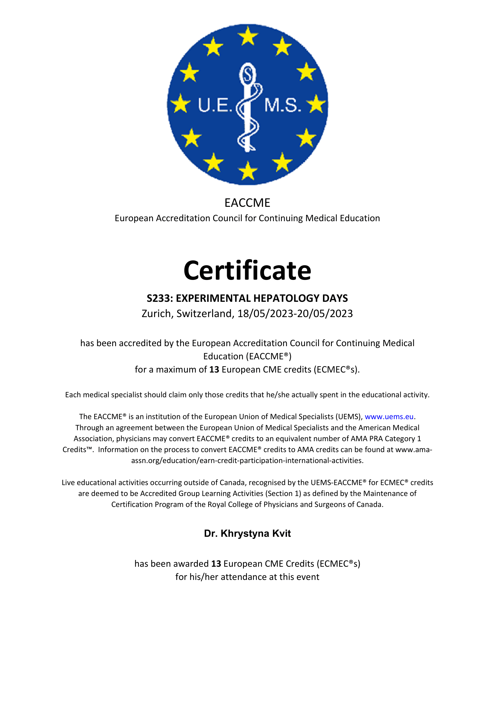 - International postgraduate course of the EAGEN «New solutions – new challenges in digestive diseases» (Київ, 2013)