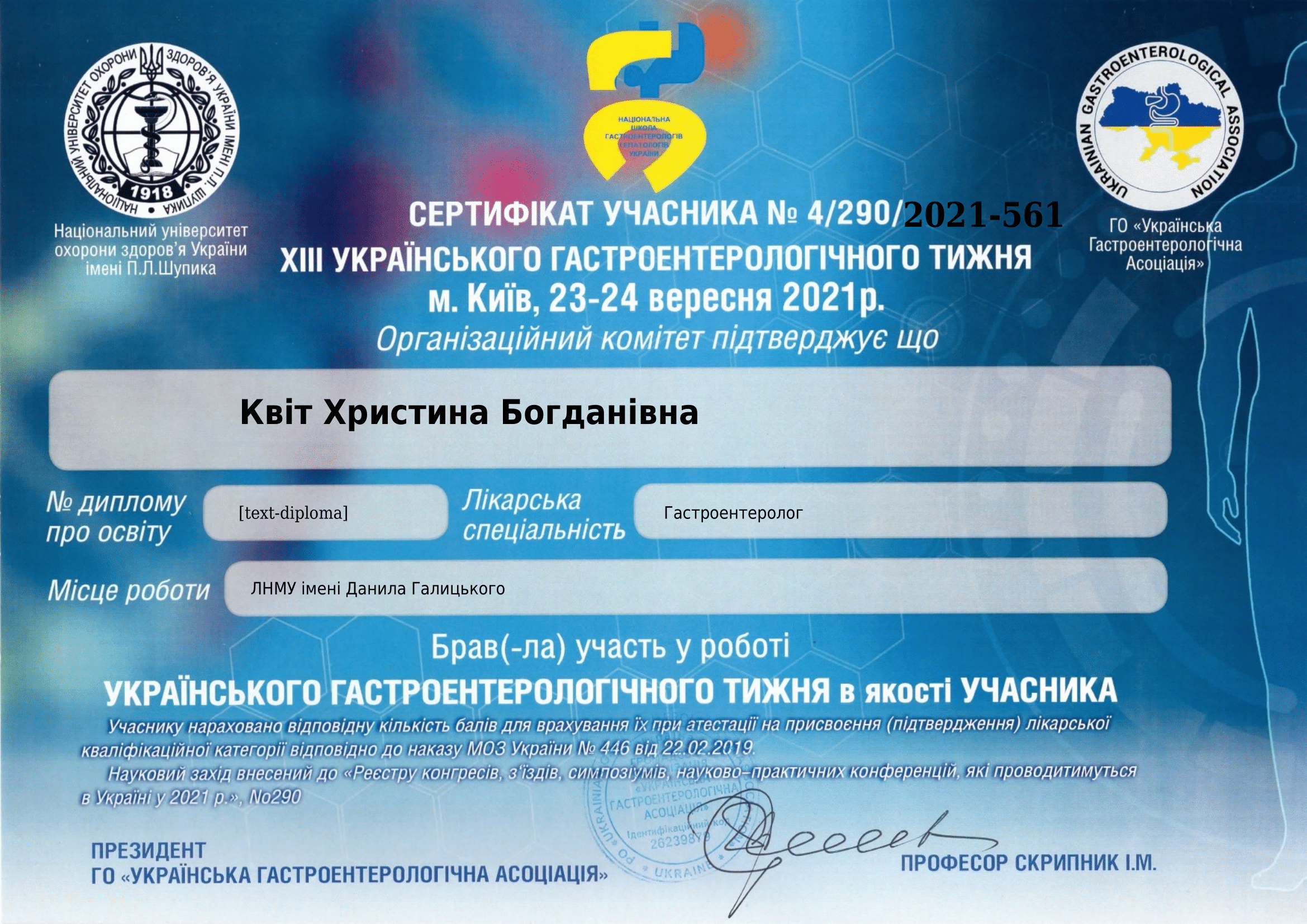 - 2009-2011р.- Львівський національний медичний університет імені Данила Галицького, отримання сертифікату за спеціальністю “Внутрішні хвороби”