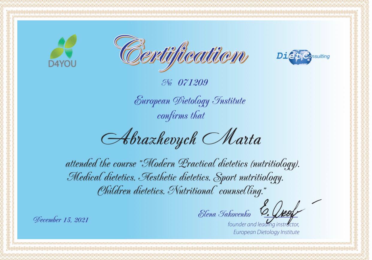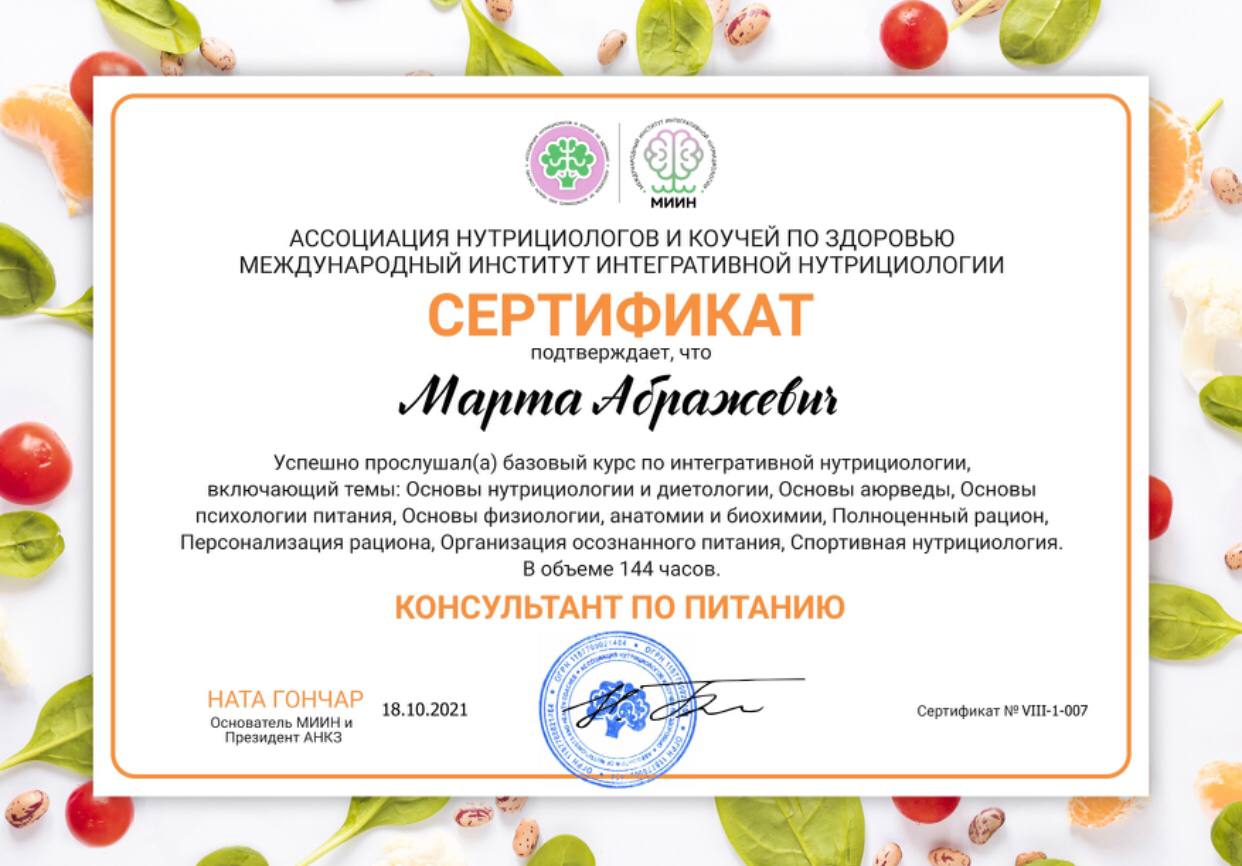 - Міжнародний інститут інтегративної дієтології (онлайн, 2021)